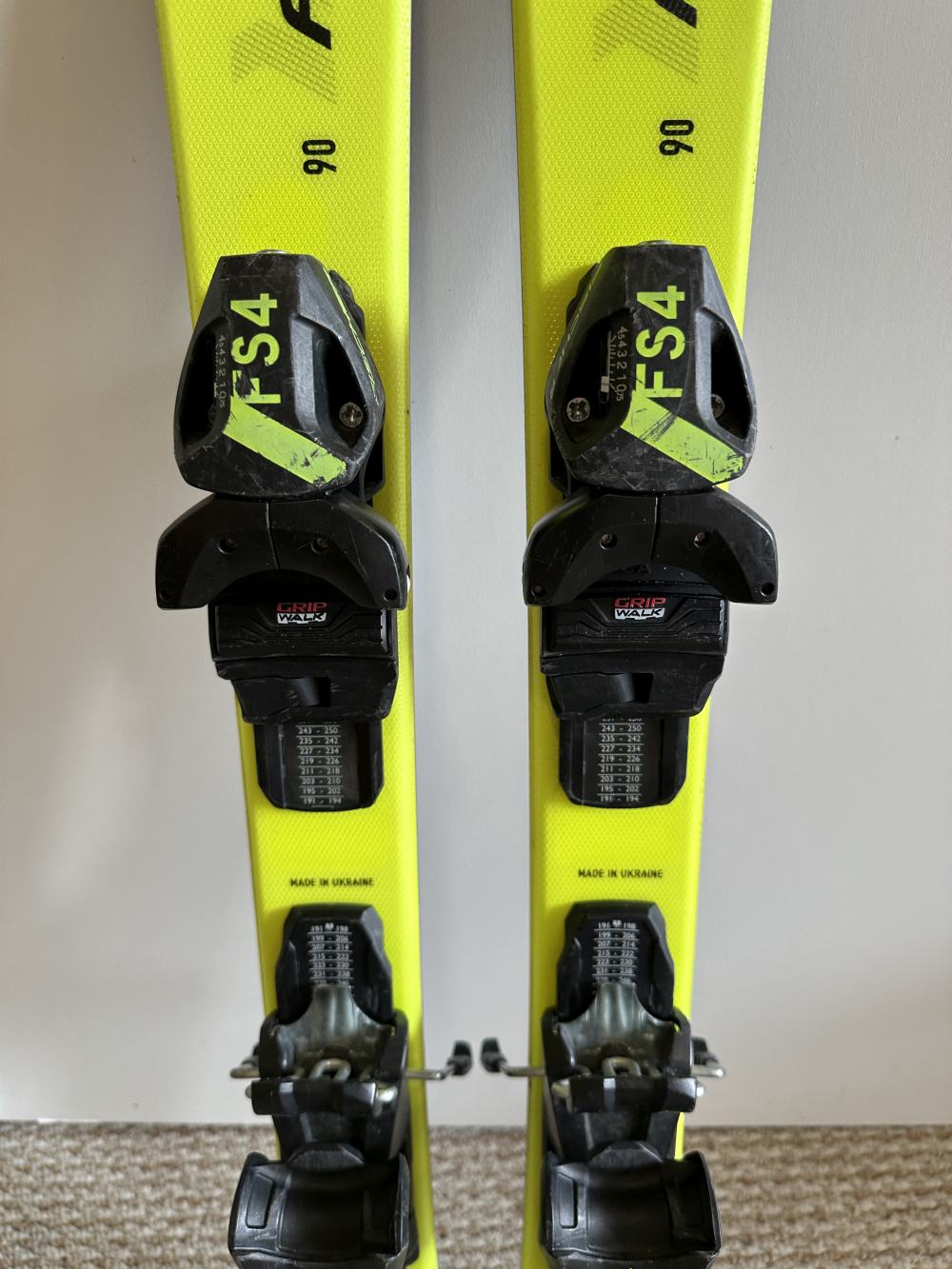 Fischer kötéssel ami bármekkora méretben állítható és 65kg-ig terhelhető.